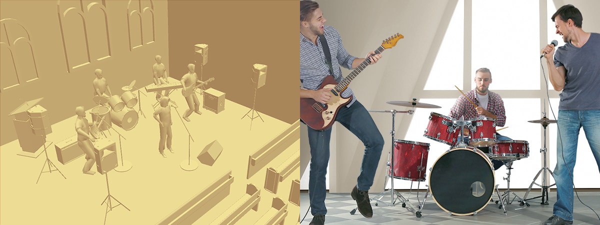 Un sistema de PA compacto y portátil con potencia suficiente para actuaciones en directo de bandas en pequeños escenarios interiores para una audiencia de hasta 100 personas, dependiendo de la cantidad de asientos y del tamaño del recinto.