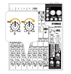 (7) La salida de audio de los mezcladores de DJ es estéreo. Gira el mando de panoramización (PAN) del canal 3 hacia la izquierda y el del canal 4 hacia la derecha con el fin de producir una imagen estéreo. (No necesitas hacer nada si estás utilizando el canal 5/6, ya que su panoramización ya está ajustada a izquierda y derecha).