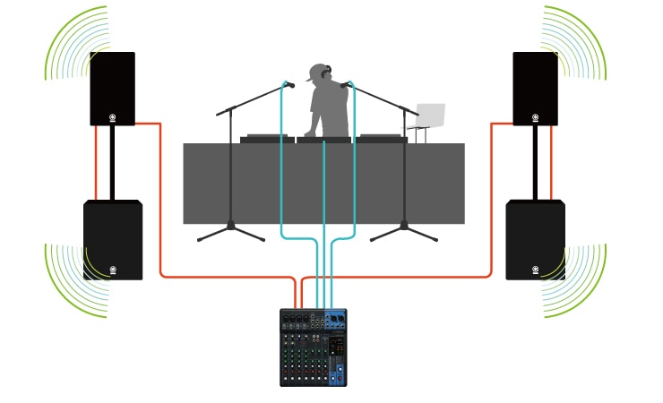 (5) Conecta las salidas del mezclador de DJ a las entradas del mezclador MG10XU. Los cables de las conexiones dependen del tipo de conectores utilizados en el mezclador de DJ.