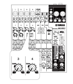 (1) Pon la ganancia (GAIN) y los faders del mezclador, así como el volumen de los altavoces autoamplificados, al mínimo.