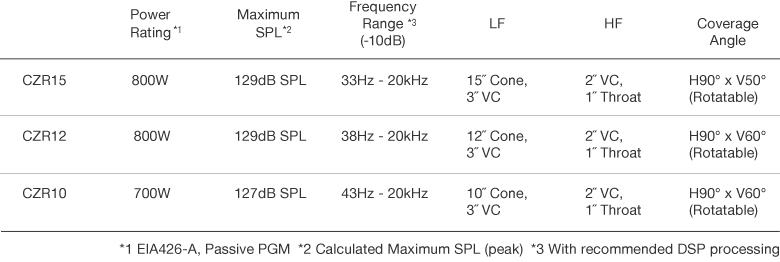 La serie CZR cuenta con modelos de 15˝, 12˝ y 10˝ con transductores con armazón de aluminio fundido a presión con una bobina de 3˝ para una entrada de potencia muy alta, y un imán de neodimio ligero pero potente que ayuda a añadir pegada y potencia a los graves. La unidad HF consigue unos agudos vivos y elevados gracias a su diafragma de titanio con una bobina móvil de 2˝ y un imán de neodimio. Al igual que el DZR, los modelos CZR también incorporan el diseño de bocina giratoria de directividad constante (90°x 50° para el CZR15, y 90°x 60° para el CZR12 y el CZR10) para una mayor flexibilidad en el montaje vertical u horizontal.
