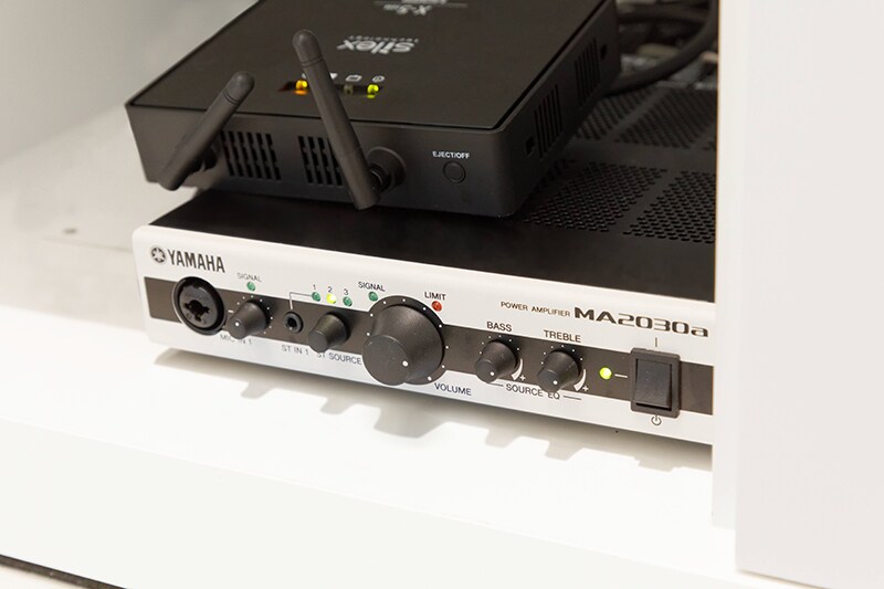 “Sí. Podemos seleccionar la música de fondo proporcionada por USEN (una compañía japonesa que emite servicios de contenidos musicales) o el audio de los programas de vídeo a través de selectores situados en los paneles de control. Normalmente, el sonido de los pisos primero y segundo están enlazados de modo que suena la música de fondo de USEN en ambos pisos. Pero cuando se proyectan vídeos en el segundo piso, la música de fondo continúa sonando en el primer piso mientras que se selecciona el audio correspondiente al vídeo para el segundo piso. Todo lo que tenemos que hacer es pulsar un selector en un controlador DCP1V4S-US. Es muy sencillo, y eso es perfecto para nosotros”.