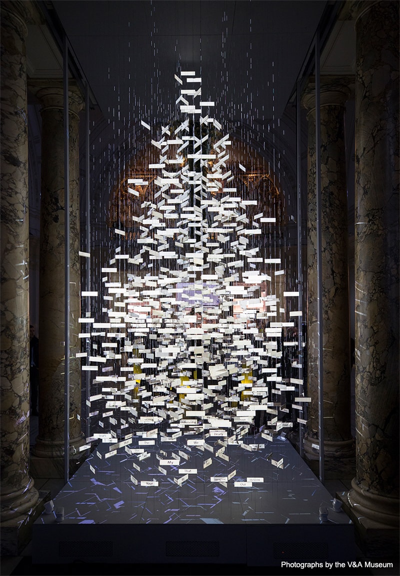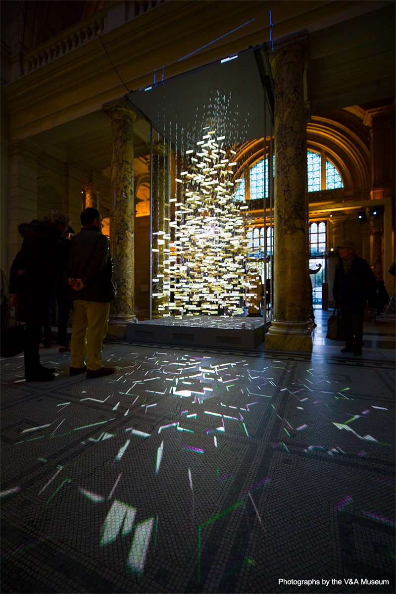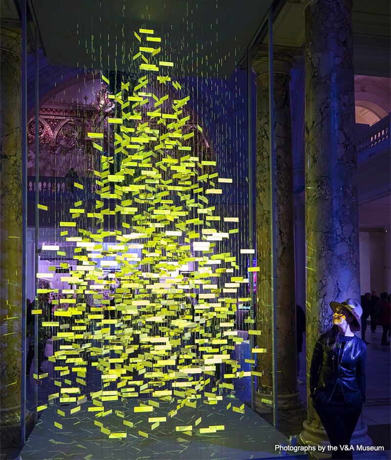 Located in the main Cromwell Road entrance of the V&A, The Singing Tree’s concept is for museum visitors to create a new Christmas carol by each contributing a word. Using eight high powered projectors with advanced pixel-dividing technology, these words are projected onto a thousand tiny planks of birch plywood, threaded onto vertical wires and arranged in the familiar shape of a spruce tree.