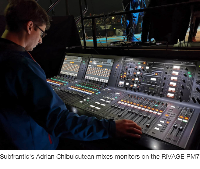 Este evento fue la primera vez que Adrian mezcló en la plataforma RIVAGE y le resultó muy fácil adaptarse a ella. "PM7 es muy intuitiva. Es fácil de trabajar, todo lo que necesitas está siempre a mano", dice. "Es un sistema muy lógico y fue fácil aplicar los conocimientos que he adquirido en el PM5D y CL5."