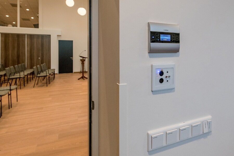 El sistema está configurado en cinco zonas, una para cada área, con zonas adicionales para los bucles de audición asistida en la iglesia y las Salas 1/2. El control del sistema se realiza mediante cuatro paneles MCP1 montados en la pared, uno en cada área interior. Cada MCP1 tiene entradas locales XLR y RCA montadas cerca del panel.