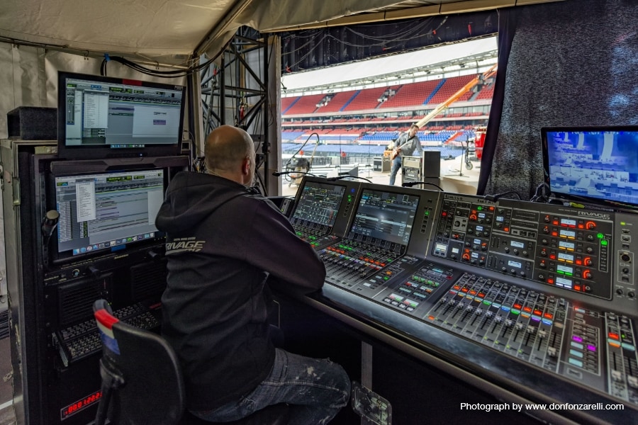 Los espectáculos necesitaban una producción de audio igualmente impresionante, suministrada por Peak Audio, con sede en Utrecht, que ha trabajado con el artista durante muchos años. El experimentado ingeniero y diseñador de sistemas de FoH, Barak Koren, desplegó múltiples line array, asegurando que se pudiera escuchar una mezcla de alta calidad en todos los asientos. Esto dio como resultado un número sin precedentes de cero quejas de los 250.000 espectadores. Por supuesto, un buen sonido en el escenario requiere un buen sonido en el escenario para comenzar, que es donde el ingeniero de monitores Paul Duwel ha ocupado el puesto de Marco desde 1996. Fue Paul quien ayudó a convencer a Peak Audio para que invirtiera recientemente en un sistema RIVAGE PM7 de Yamaha.