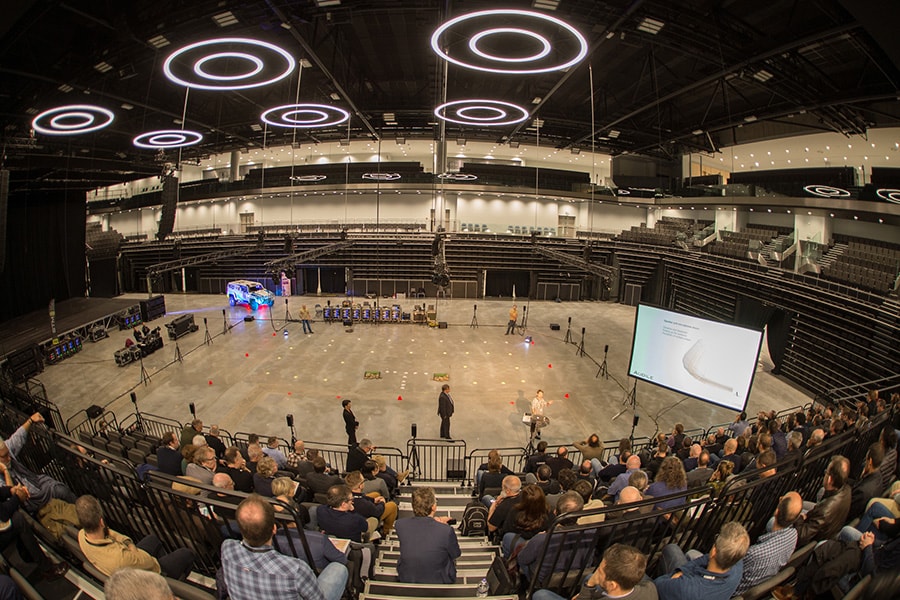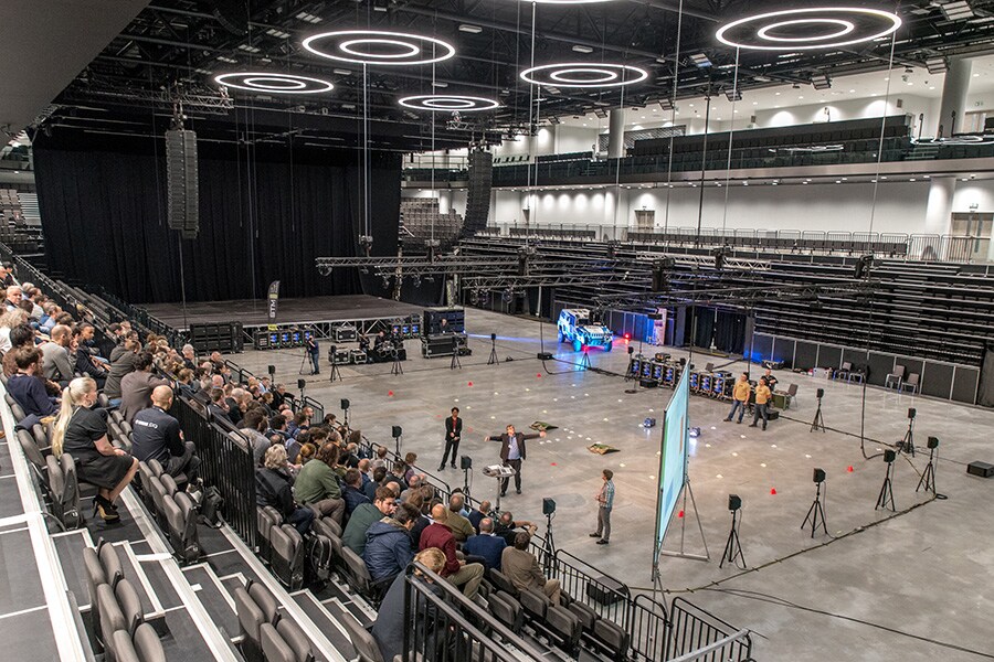 Featuring a wide range of conference facilities and a 4500-seat sports arena, the O2 universum was the perfect location to set up demonstration immersive sound systems in both the largest conference room and the arena, as well as comparing them to a large format NEXO L-R line array system flown in the arena.