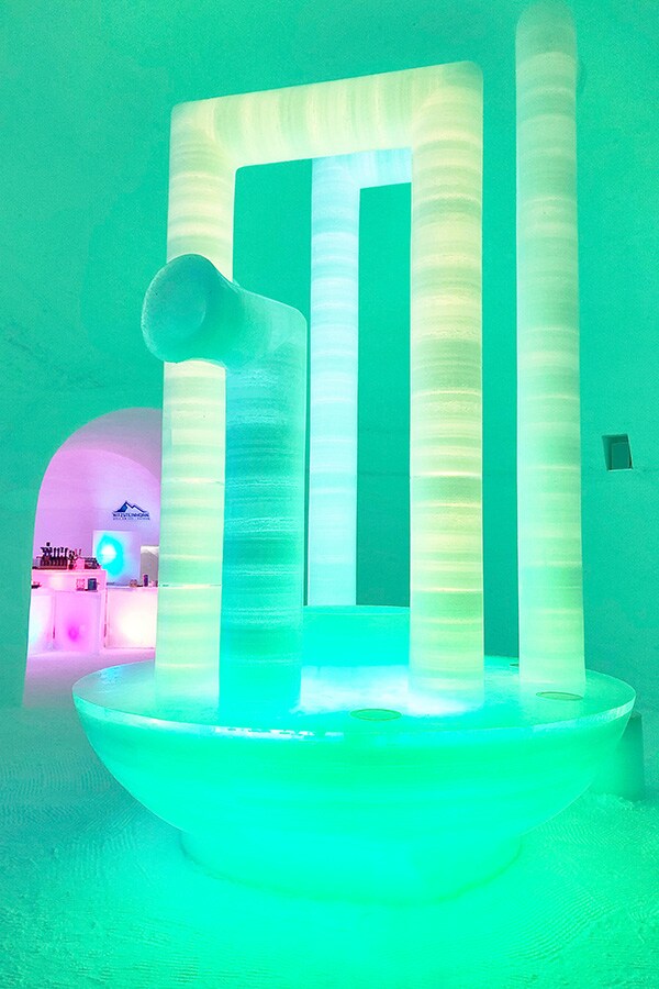 Situado a 2.600 metros sobre el nivel del mar, el Ice Camp 2020 comprende tres iglús de diseño único, cada uno de 12 metros de diámetro y 6 metros de altura. La pieza central es el único Sinfónico de Hielo, creado por el artista austriaco Max Seibald. Hecho completamente de hielo, este impresionante instrumento es esencialmente una especie de "bol cantante" con trompas gigantes y estilizadas. Los visitantes pueden usar las almohadillas táctiles para cambiar los sonidos que, como dice el artista, "evocan una atmósfera de sublime armonía en combinación con la suave 'música de las esferas'".
