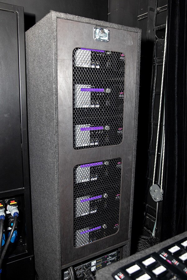 The system, designed to be highly efficient and energetic enough for a rock music venue, consists of seven per side STM M46 main modules and seven STM B112 bass units, hung two-deep. Two STM M28 omni purpose modules are suspended from each cluster to provide down fill, and 18 STM S118 subwoofers have been arrayed along the front of the stage to ensure even low frequency coverage. P12 and PS15 are used for stage monitors. The system is driven by 21 NEXO NXAMP4x4 4-channel Powered TD Controller fitted with NXDT104 Mk2 Dante audio network cards, providing a total of 84 amp channels. Side fills consist of four NEXO GEO S1210 cabinets and four LS18 subwoofers, with four GEO M1012s for front fill.