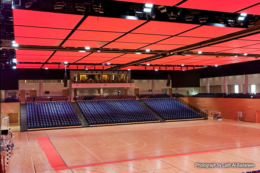 Basketball is one of the key sports played in the hall and dedicated microphones above each hoop are used to enhance the sound of the ball hitting the backboard, relayed to supporters through dedicated clusters of flown and floor-mounted supporter speakers, with boosted late reflections from extra speakers behind the bleachers and through the ceiling array for added ambience. Similarly, an eight microphone array above the field of play picks up the sound of the basketball being bounced and enhances it through early reflections from the wall-mounted speakers, further augmented by the diffused field from the ceiling array.