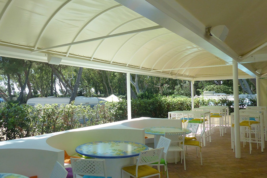 More gazebos cover La Ninfea restaurant, in this case ten 49m2 units with a 56m2 extension. The sound here had to be high quality and seamless throughout the dining area, but as quiet as possible outside it. This was achieved with a carefully-designed layout of 24 VXS5 surface mount speakers, using two different power taps, powered by two automatically activated PA2120 power amps and another WXC-50 as preamplifier and music player.