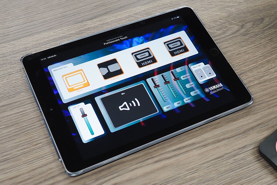 Toyoura: The ADECIA processor is remotely installed by ProVisionaire, a custom control panel software that allows remote control and monitoring of the system. For example, if you wirelessly convert to ClickShare, even if you don't have a host computer at hand, this iPad allows you manually to mute the microphone. You can also raise or lower the speaker volume, or use the switcher to toggle between videos during a regular meeting. You can also play or stop a Blu-ray player that supports Yamaha's wireless remote called MusicCast. ProVisionaire also offers the advantage of being able freely to design your screen with the feel of PowerPoint according to the application for use.