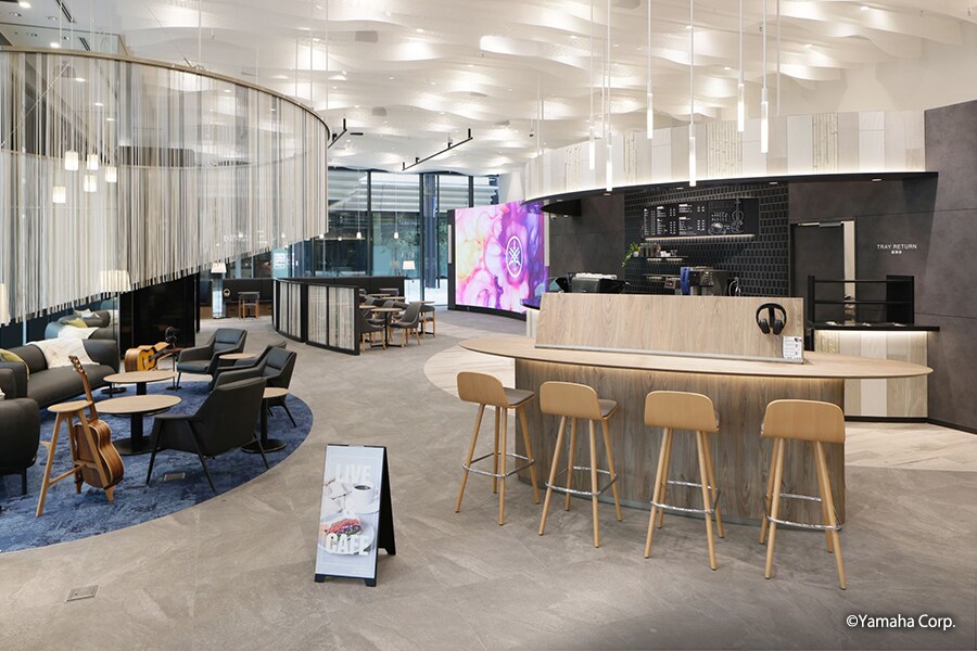 Located close to Yokohama railway station, its first floor features an entrance atrium and the Music Canvas zone. On the second floor, a large open plan space connects a café with a relaxing area where visitors can try musical instruments, along with a space for performances by invited artists.