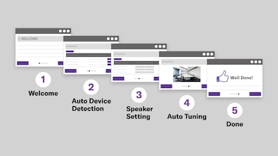El sistema detecta automáticamente todos los componentes y los configura para que estén optimizados para el entorno de la sala, teniendo en cuenta la ubicación de los altavoces y los micrófonos, las características de reverberación de la sala y el comportamiento del eco. Ajustarr una sala puede ser tan fácil como seguir el configurador a través de cuatro pasos de configuración.