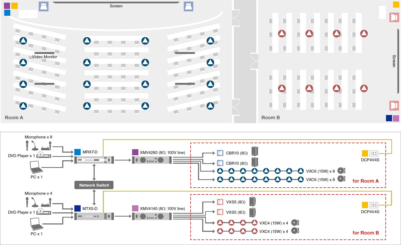Los procesadores MRX7-D y MTX5-D permiten la conexión a redes de audio con grandes distancias sin retardo ni degradación en la calidad del sonido. En una configuración apropiada preprogramada con el software MTX-MRX Editor, es posible retransmitir audio simultáneamente a todas las salas con solo pulsar un botón.