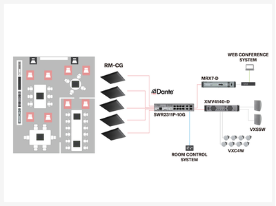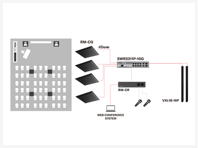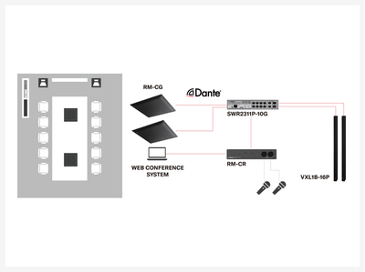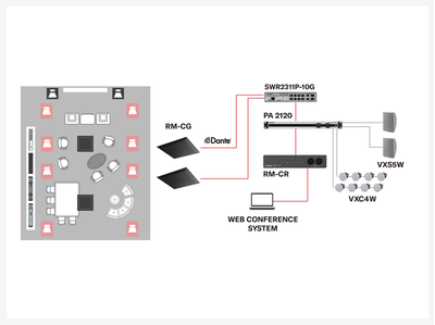Los altavoces Dante VXL1-16P ofrecen una reproducción de sonido clara. El sistema se integra fácilmente con las plataformas UC. El procesador de conferencia RM-CR se encarga de todo el enrutamiento de audio automáticamente.