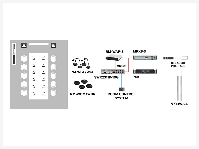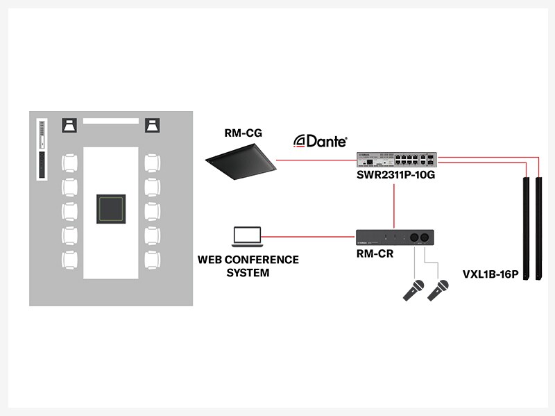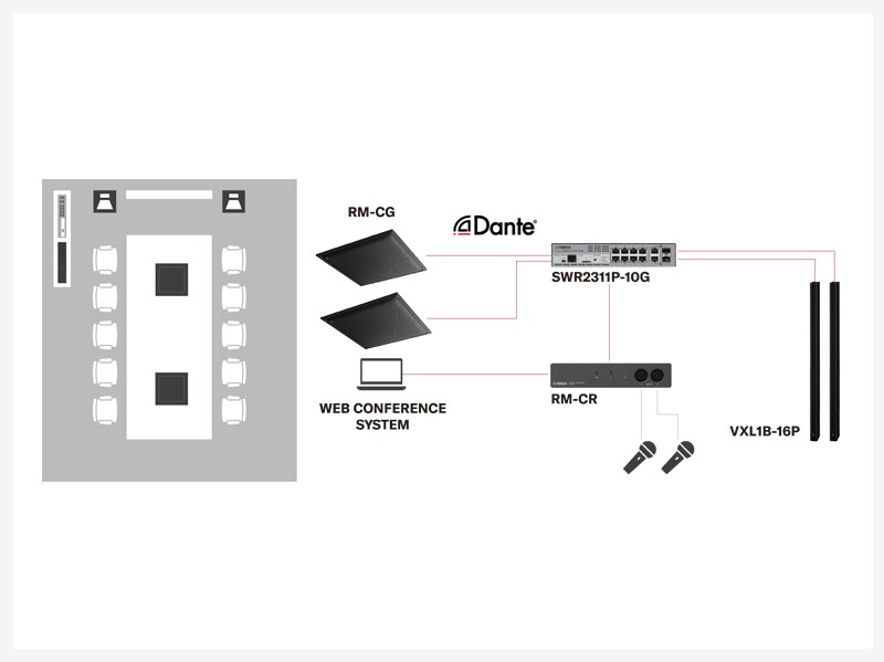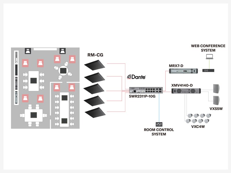 Los altavoces Dante VXL1-16P ofrecen una reproducción de sonido clara. El sistema se integra fácilmente con las plataformas UC. El procesador de conferencia RM-CR se encarga de todo el enrutamiento de audio automáticamente.