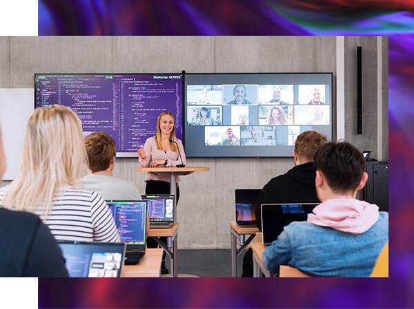 En un auditorio universitario, es importante que todos puedan escuchar al profesor. En un entorno educativo híbrido, también debe ser posible escuchar las preguntas de los estudiantes desde la sala de conferencias.