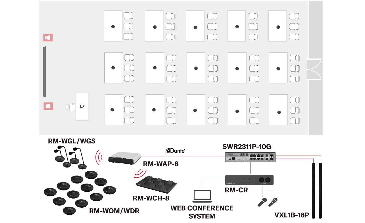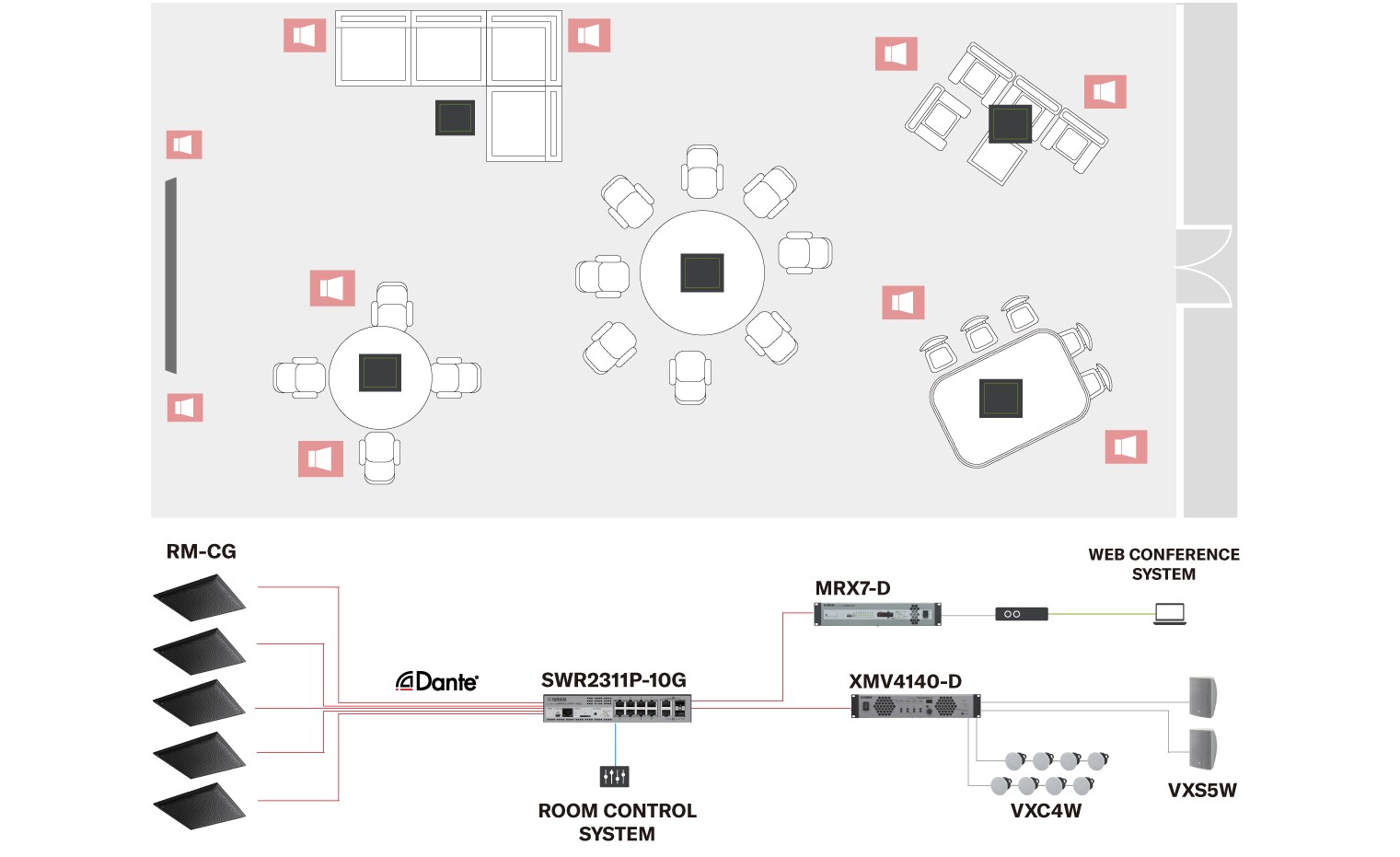 Si desea utilizar una sala grande de forma variable, una solución personalizada es la mejor opción, combinando 5 micrófonos de techo RM-CG con un procesador de matriz MRX7-D y un amplificador XMV-4140D a una solución muy variable.