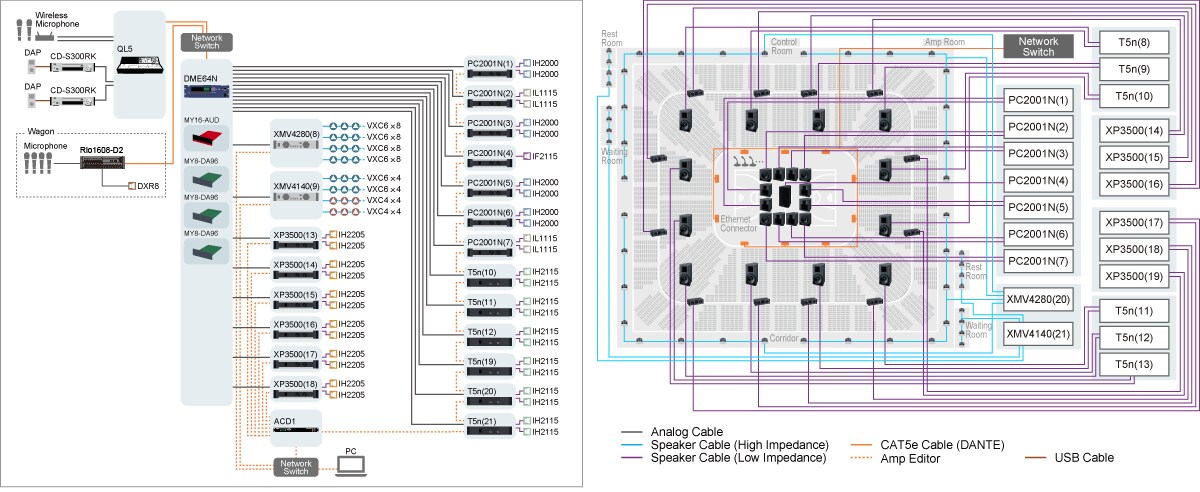 En este sistema en el que el audio debe ser transmitido sobre distancias largas, un motor de mezcla digital, cable óptico y una red Dante son capaces de suministrar sonido de muy alta calidad. Esto reduce la cantidad de cableado requerido a la vez que evita la degradación de la señal durante la transmisión.
