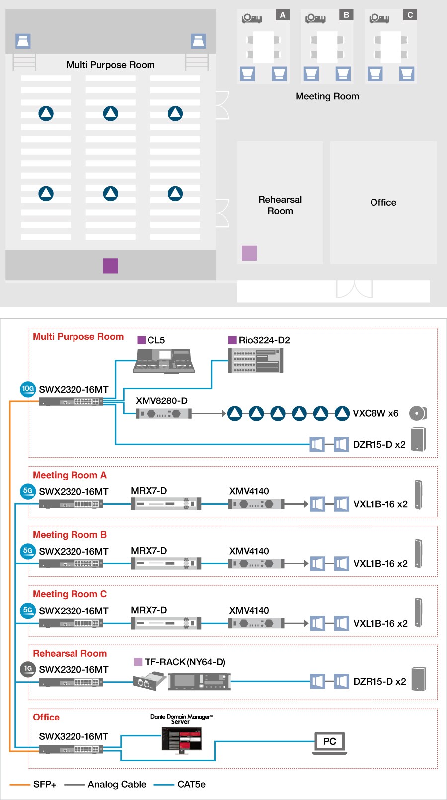 Network traffic is also anticipated to grow in the professional audio market as rates and channel counts for audio and video media increase. By incorporating our new SWX3220-16MT and SWX2320-16MT models, systems can be configured with L2 switches that transmit audio and video media within single segments, as well as L3 switches to prepare for increased traffic of media that spans multiple segments. Moreover, since these models support IEEE 1588 PTPv2 TC (Transparent Clock), they can also be used to construct systems where high-precision media synchronization is a requirement.