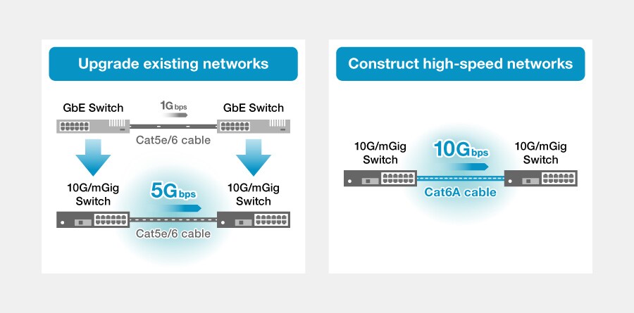 All of these new switches feature LAN ports that support five speeds (100 M/1 G/2.5 G/5 G/10 G). The speed of existing networks that use Cat5e or Cat6 LAN cables can be increased to 5 Gbps by replacing the GbE switches with these new models. When building new networks, you can create 10 Gbps networks by using these models with Cat6A LAN cables.