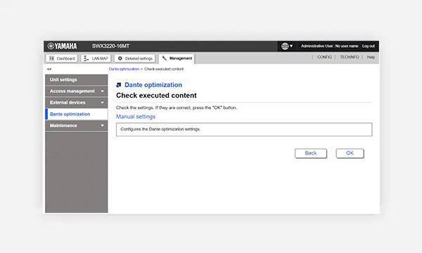 All newly released switches support Dante settings optimization, which makes optimal setup easy for Dante audio over IP technology. If Yamaha products that support Dante are connected, enabling “Dante optimization” settings in the browser interface will set their QoS, multicast snooping, flow control, EEE, and other settings to optimal values automatically. Moreover, in addition to the existing LAN mapping function, which has been praised by users, the entire Dante network can be visually represented with the Yamaha LAN Monitor computer application.