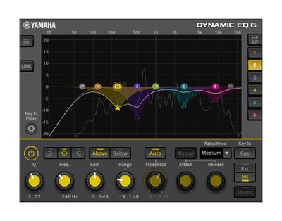 El Dynamic EQ6 es un ecualizador dinámico de seis bandas, que incluye un conjunto de funciones ampliado, combinando la ganancia estática con el control de rango dinámico y añadiendo filtros de paso alto/bajo a las funciones de los plug-ins Yamaha Dynamic EQ anteriores.