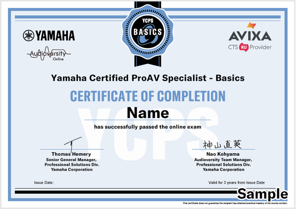 Los cursos seleccionados de Audioversity ofrecen a los titulares del CTS de AVIXA la oportunidad de obtener créditos de Unidad de Renovación (RU) con un certificado de finalización del curso. Algunos cursos también ofrecen la certificación Yamaha, que valida el compromiso del alumno con su desarrollo profesional y ayuda a mejorar sus perspectivas de carrera y abrir nuevas oportunidades.