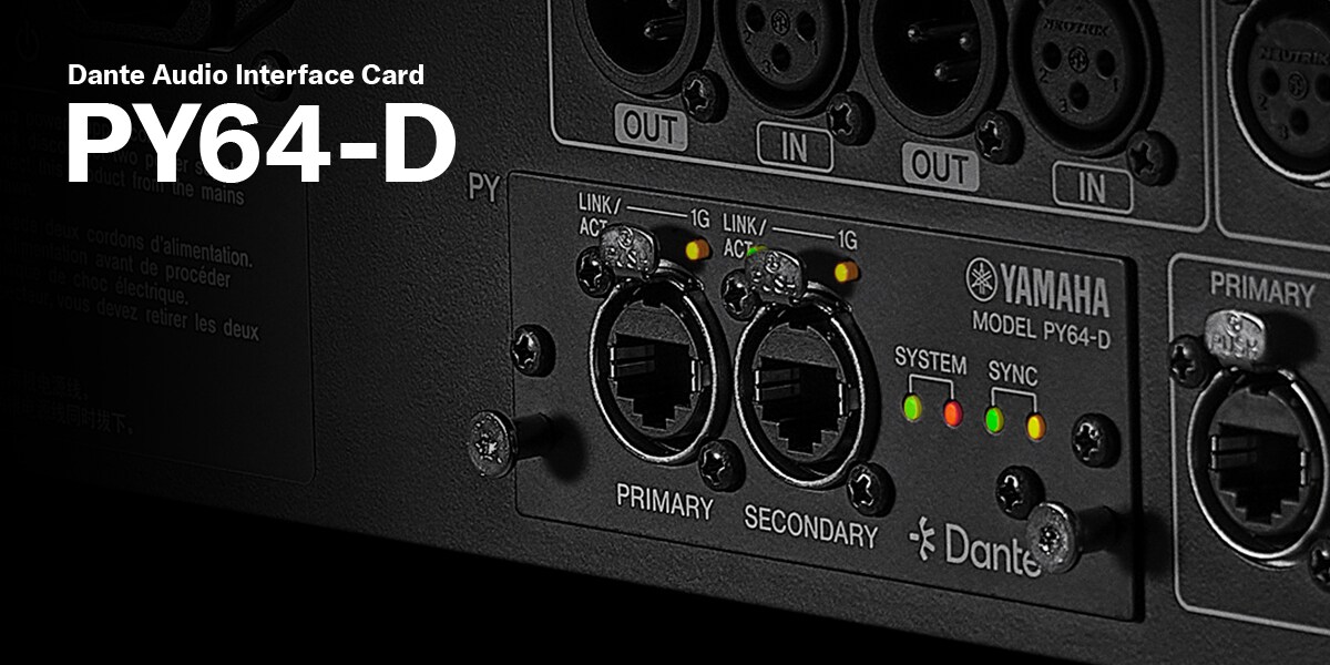 La PY64-D proporciona 64 entradas/salidas a 96 kHz con SRC, con conectores primario y secundario para soportar redundancia. También admite conexiones en cadena.