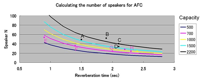 Los puntos de datos marcados corresponden a recintos reales. Los símbolos de la A a la D están ubicados en la línea de 2.200 asientos. Los símbolos de la E a la H están ubicados en la línea de 700 asientos. Este método para la estimación de la cantidad de altavoces AFC parte de un supuesto. Al considerar la ubicación de los altavoces, el valor de la energía del sonido directo procedente del altavoz AFC es -22 dB en relación con el valor de la energía de las reflexiones físicas procedentes de la fuente.