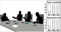 Cuando una persona está hablando, la ganancia del micrófono correspondiente se eleva instantáneamente a 0 dB, mientras que la ganancia de otros micrófonos se reduce. Lo mismo ocurre en cualquier canal cuando solo una persona está hablando.