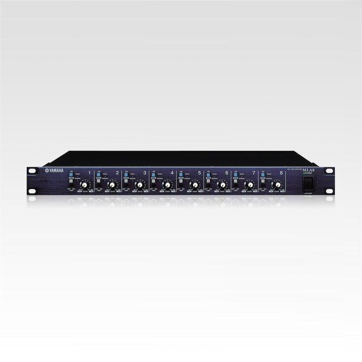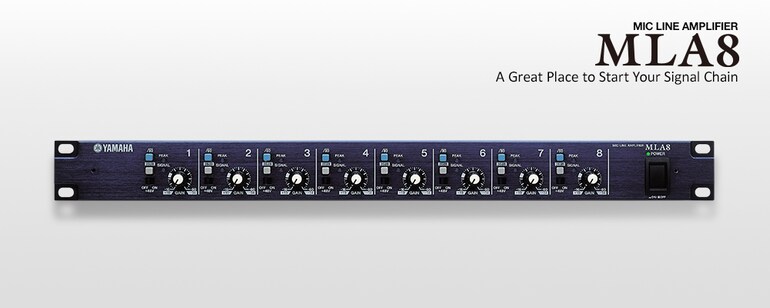 El MLA8 es un preamplificador de ocho canales que ha heredado la tecnología de altas prestaciones de la consola de mezcla digital DM2000 de Yamaha. Alojado en una compacta unidad tamaño 1U, el MLA8 dispone de un pad de 26 dB, ajuste de ganancia de 44 dB, un filtro de paso alto de 80 Hz y un interruptor de alimentación phantom en cada canal. El panel posterior incluye terminales Euroblock y un conector D-sub de 25 patillas para conexiones de salida, lo cual convierte al MLA8 en perfectamente compatible con mezcladores digitales Yamaha.