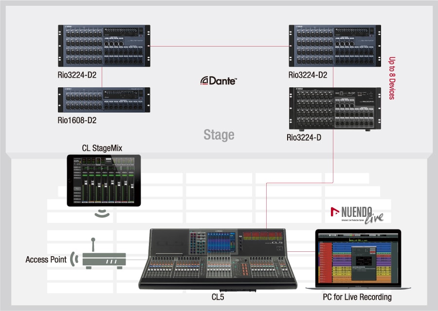 En los sistemas RIVAGE PM es posible combinar y operar simultáneamente las unidades Rio3224-D2 / Rio1608-D2 conectadas a través de Dante, y las unidades RPio622 / RPio222 conectadas a través de TWINLANe. Una red Dante puede gestionar hasta 24 dispositivos Dante, incluidas las unidades Rio3224-D2 / Rio1608-D2, mientras que una red TWINLANe puede conectar hasta ocho unidades RPio622 / RPio222. Todo el sistema puede operar a 96 kHz.