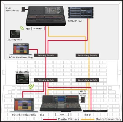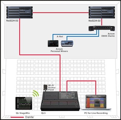 En este compacto pero capaz sistema de sonido en vivo, una consola de la serie CL es usada como FOH mientras que una consola QL al lado del escenario funciona como mezclador de monitores y dispositivo de E / S gracias a su capacidad Puerto a Puerto. La función de Compensación de ganancia hace que la ganancia del preamplificador se puede controlar de forma segura desde cualquiera de las consolas sin interferencias. Para una máxima fiablidad del sistema, se utiliza una configuración de red en estrella con switches de red para la redundancia, de modo que un problema en una parte de la red no interrumpa el flujo de la señal en general. También es posible la grabación en vivo en múltiples ordenadores.