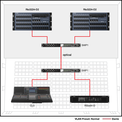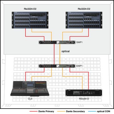 Un switch SWP1 está situado en el escenario y otro en la ubicación de la mesa principal. La conexión por fibra óptica entre los switches permite una transmisión de datos fiable en distancias de hasta 300 metros. Se puede conectar un ordenador a cualquiera de los dos switches para monitorizar y gestionar el control de toda la red.