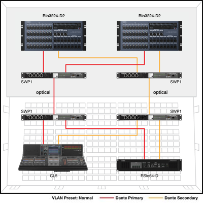 En este ejemplo, se ha configurado una VLAN sobre los switches SWP1, con la línea primaria Dante asignada a VLAN1 y la línea secundaria asignada a VLAN2. Solo hacen falta dos switches para tener conexiones de cableado redundantes. Es necesario añadir módulos ópticos MMF-SWP1 (opcionales) a los switches SWP1 para permitir conexiones ópticas en cada línea.