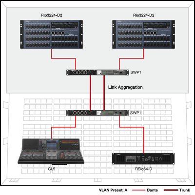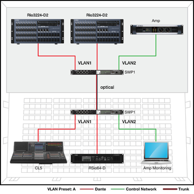 En este caso, VLAN1 maneja la red Dante mientras que VLAN2 alberga una red de control y monitorización de los amplificadores. Esto aísla y protege el control de los amplificadores de la comunicación multicast Dante.
