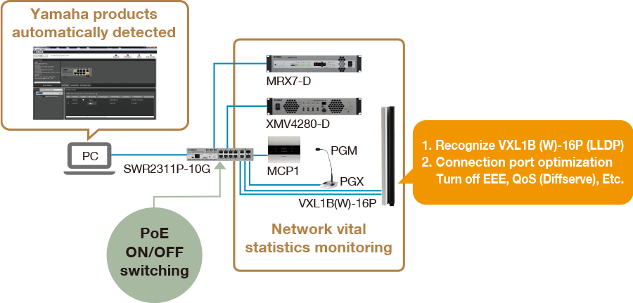 El SWR2311P-10G es un switch L2 inteligente que proporciona la funcionalidad ideal para redes de audio digitales Dante (un tipo de red desarrollada por la Corporación Audinate y que ahora se utiliza en todo el mundo), lo que permite la construcción de una red estable que simplifica los ajustes, la supervisión, la gestión y el funcionamiento. Al conectar el VXL1-16P al SWR2311P-10G, se realizan automáticamente los ajustes óptimos para Dante a través de LLDP, un protocolo para los datos de gestión del sistema que pasan entre un dispositivo y otro dispositivo vecino. Los puertos compatibles con PoE pueden suministrar un máximo de 30 W a todos los puertos simultáneamente. Puede alimentar no solo a dispositivos compatibles con PoE, como el controlador de pared MCP1 que se utiliza para controlar el volumen de los equipos de sonido utilizados en salas de conferencias o puntos de acceso inalámbricos, sino que también puede también puede proporcionar alimentación sin problemas incluso a dispositivos que requieren mayor salida de PoE como el VXL1B-16P o el VXL1W-16P.