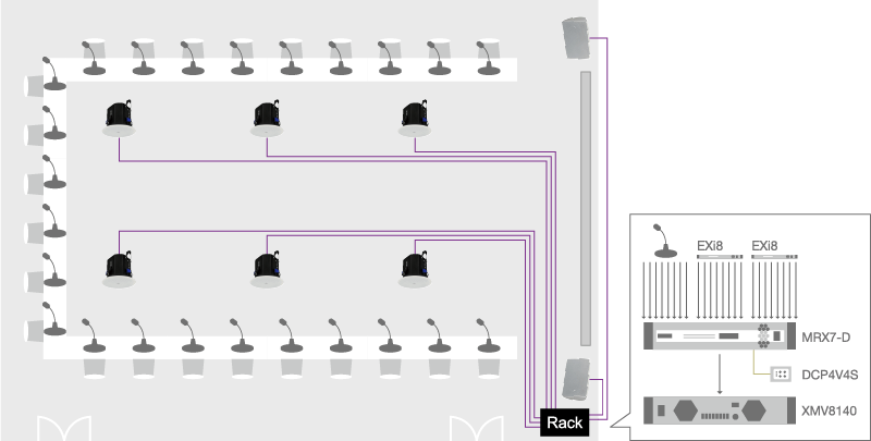 Junto al MRX7-D, el asistente permite añadir procesadores de matriz de la serie MTX, amplificadores de la serie XMV, paneles de control digitales DCP y expansores de entradas y salidas EXi8/EXo8 y organizarlos según se necesite.
