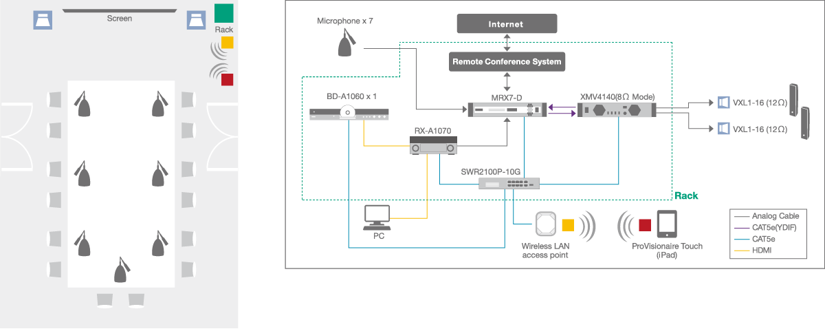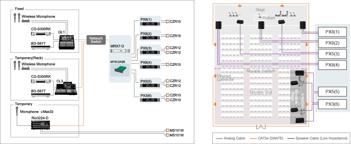 El uso de dos tipos de conexiones de red en el MRX7-D puede reducir significativamente el coste y el tiempo. La combinación de YDIF para conexiones en sistemas más pequeños y DANTE para instalaciones más grandes puede mejorar considerablemente la flexibilidad a la hora de diseñar.