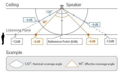 Es importante tener en cuenta que el ángulo de dispersión nominal que aparece en las especificaciones de los altavoces de techo no es el mismo que el ángulo de dispersión efectiva real del altavoz. El nivel de presión sonora (SPL) en el ángulo de dispersión nominal es 6 dB más bajo que el valor de SPL sobre el eje medido a una distancia constante del altavoz. El ángulo de dispersión efectiva se define como el ángulo en el que el valor de SPL es 6 dB inferior al valor de SPL sobre el eje en el plano de escucha. El ángulo de dispersión efectiva es normalmente un 70 u 80 % del ángulo de dispersión nominal. Los cálculos de la aplicación CISSCA están basados en ángulos de dispersión efectiva.