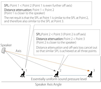 Un nivel de presión sonora uniforme puede lograrse fácilmente a lo largo del plano de escucha con los altavoces incluidos mediante la alineación del eje del altavoz con la cabeza del objetivo (oyente) más distante. Esto funciona debido a la relación entre la distancia y el ángulo de dispersión. Cuando se alinea el eje perpendicular con la última fila, la atenuación natural que se produce en la última fila por la distancia y la atenuación que se produce en las filas más cercanas por estar fuera del eje tienden a dar como resultado una distribución de SPL uniforme. CISSCA permite un ajuste preciso del ángulo de inclinación de los altavoces de montaje en superficie para que la flexibilidad en el diseño del sistema sea máxima.