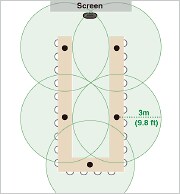 Para las configuraciones "Micrófono x 3" y "Micrófono x 5" mostradas anteriormente, la calidad de audio es superior en la configuración "Micrófono x 5", ya que los micrófonos se colocan más cerca de los participantes.