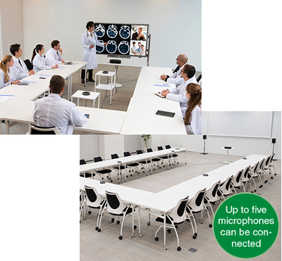 - Solución excelente, escalable y flexible para salas de reuniones grandes con configuraciones de mesa especiales, conexión en cadena de hasta 5 micrófonos y compatibilidad con 2 altavoces externos