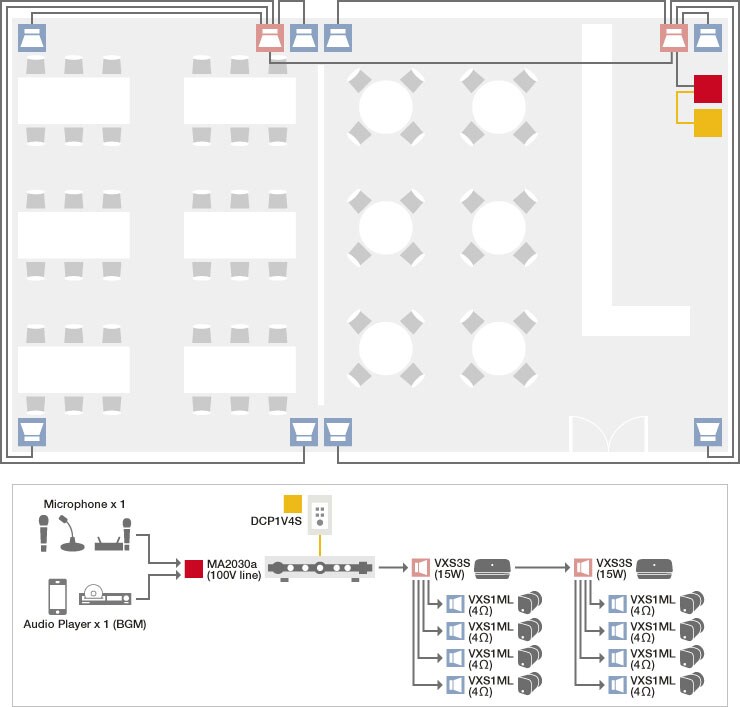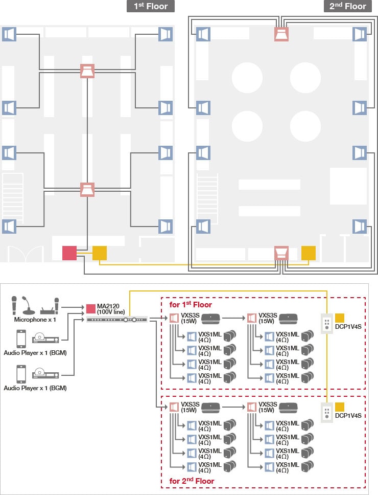 Este es un sistema donde se conecta el VXS3S con alta impedancia y construido con múltiples satélites. La potencia de volumen requerida se puede cambiar fácilmente mediante el conmutador de vatios de salida. El MA2120 puede proporcionar diferentes zonas con diferentes volúmenes en cada zona respectiva.