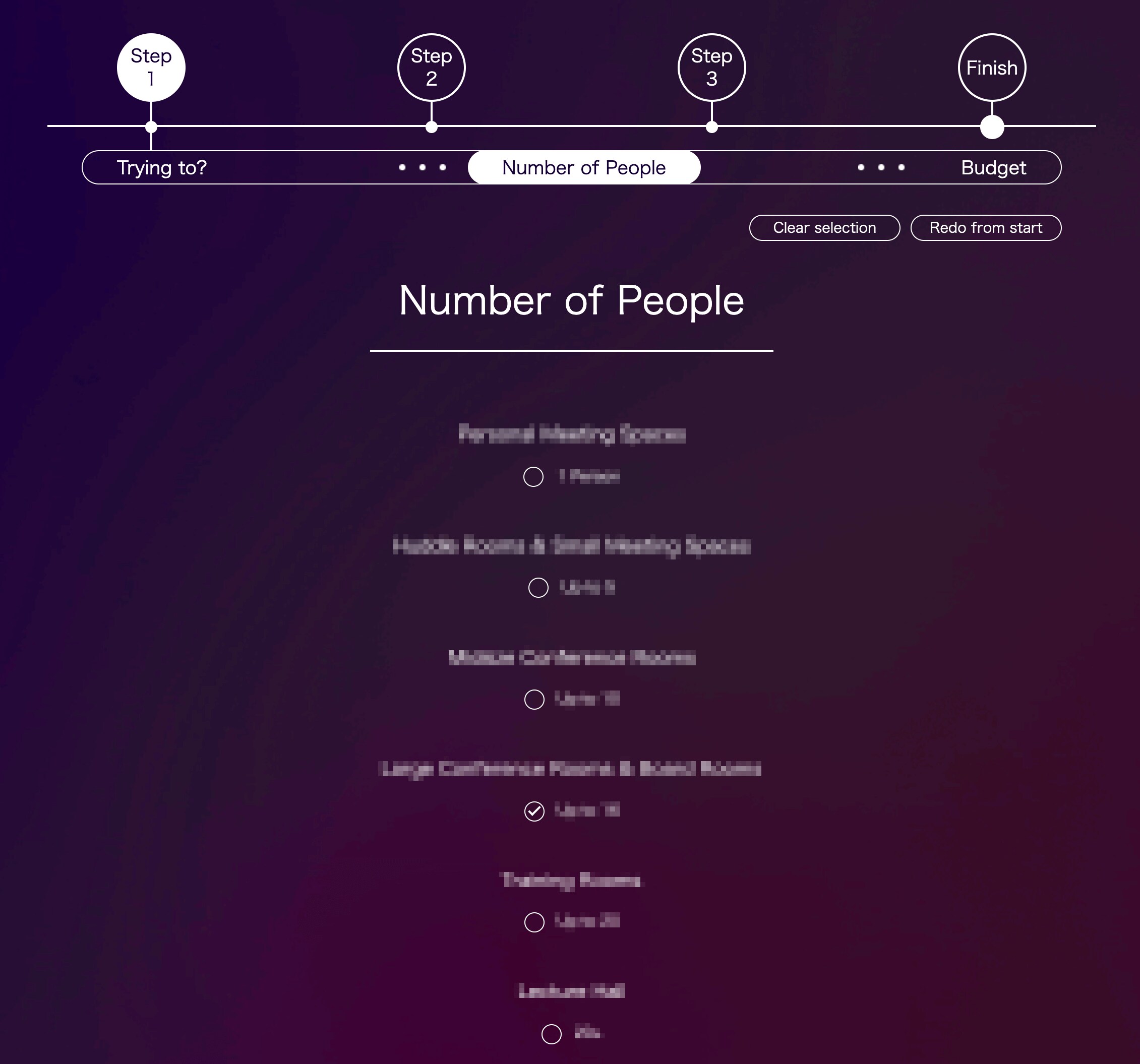 Select the estimated number of people who will use the conference room and then click "Next." Yamaha will recommend a standard room size appropriate to the number of people selected.