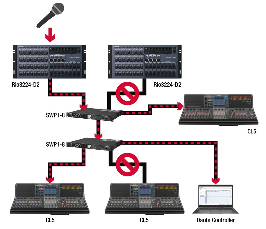 - ‑ Dante (1000base-T) bandwidth is 100 MHz so CAT5e or better cable is required.