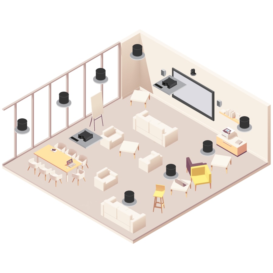 When you are using a large room (up to 150m²) Yamaha's advanced digital signal processing technologies can ensure a comfortable audio experience for everyone in attendance, providing consistent microphone and speaker performance regardless of where attendees are listening or speaking from within the space. Multiple RM-CG Ceiling Array Microphones quickly and reliably detect speakers in the room and can capture their voices authentically. Using the MRX-7D processor, the Microphones can be used for voice reinforcement, and everything can be easily controlled from a tablet interface using the ProVisionaire software.