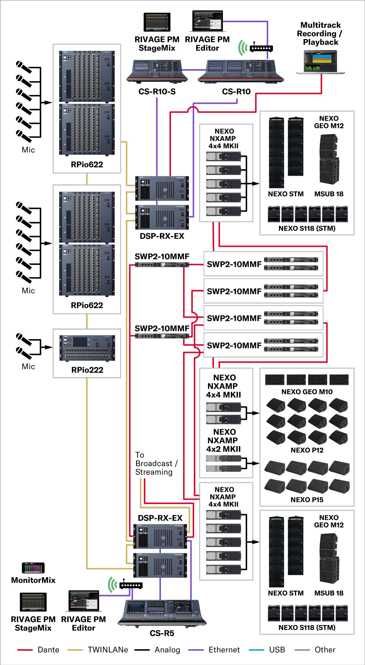 This system is designed for large outdoor venues with seating for over 5,000 people. The high quality, high power loudspeakers deliver consistent sound from the front to the rear of the venue, and the 288-channel mixing console can accommodate even the largest ensembles and orchestras. This sound reinforcement system is not only exceptional for sound quality and functionality, but also in ease of operation and system redundancy, providing critical reliability for performances where making mistakes are simply not an option.